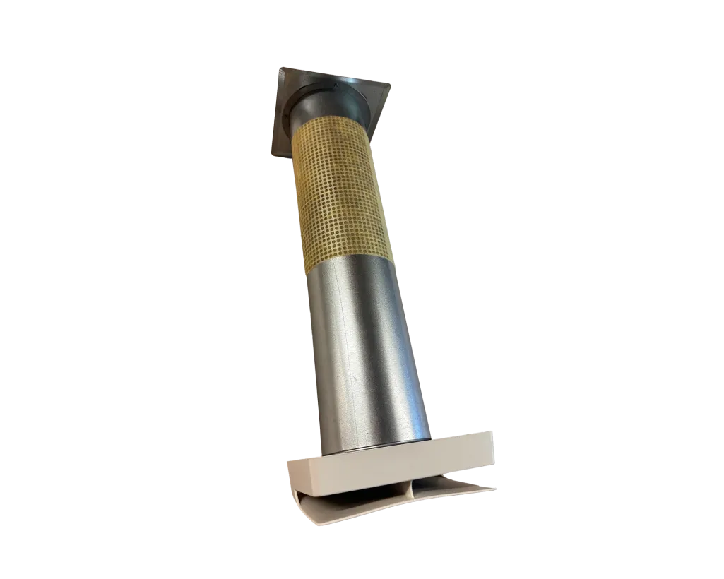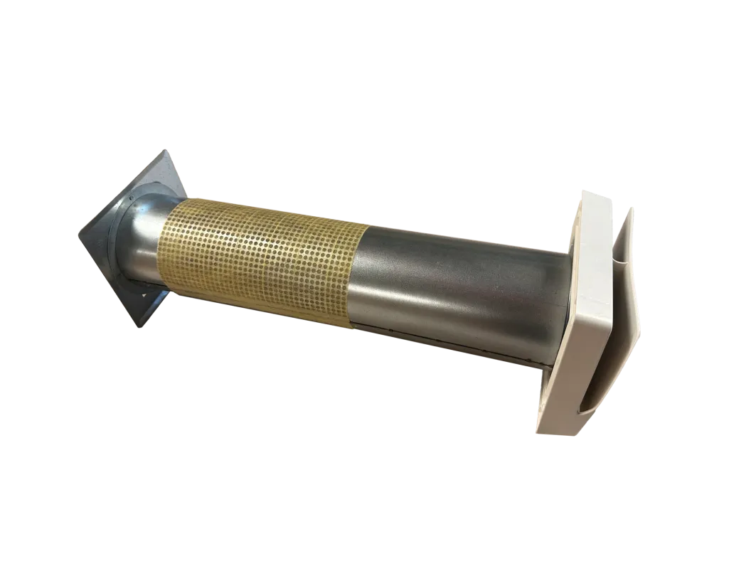 Cirkulär kanal Ø100 mm av perforerad galvaniserad plåt med ytterväggsgaller och TL-F innerdel.