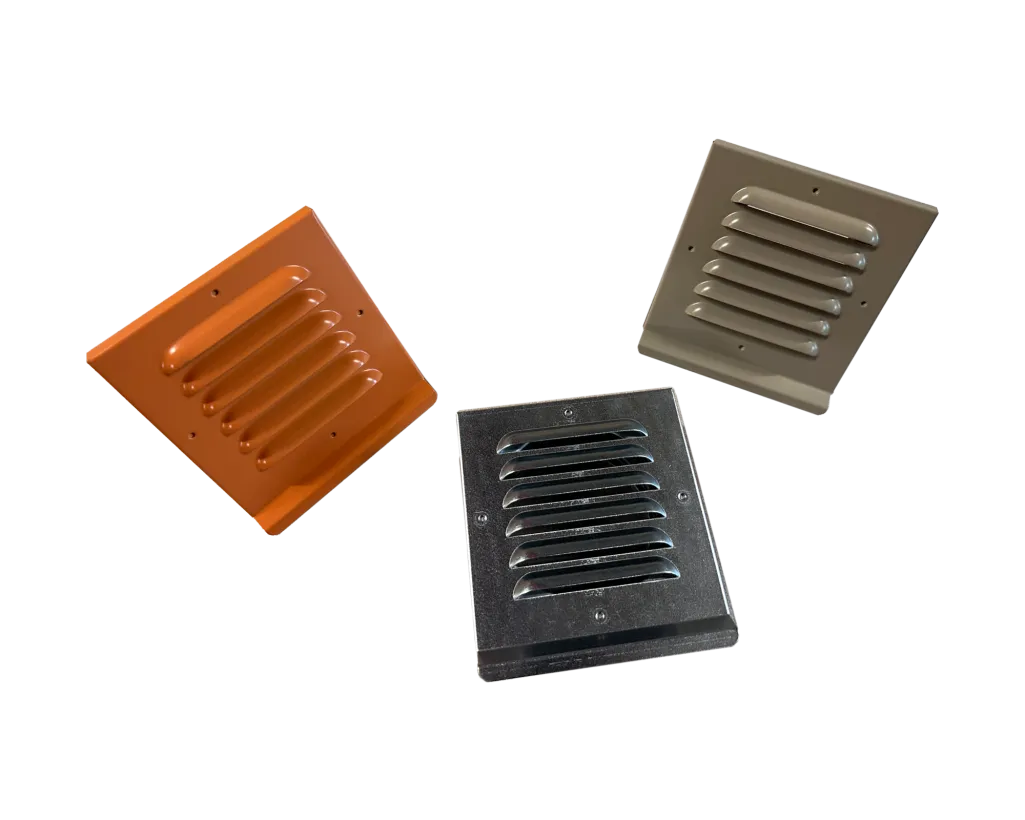 Kvadratiskt ytterväggsgaller försett med putsflänsar, cirkulär anslutning Ø100 mm.